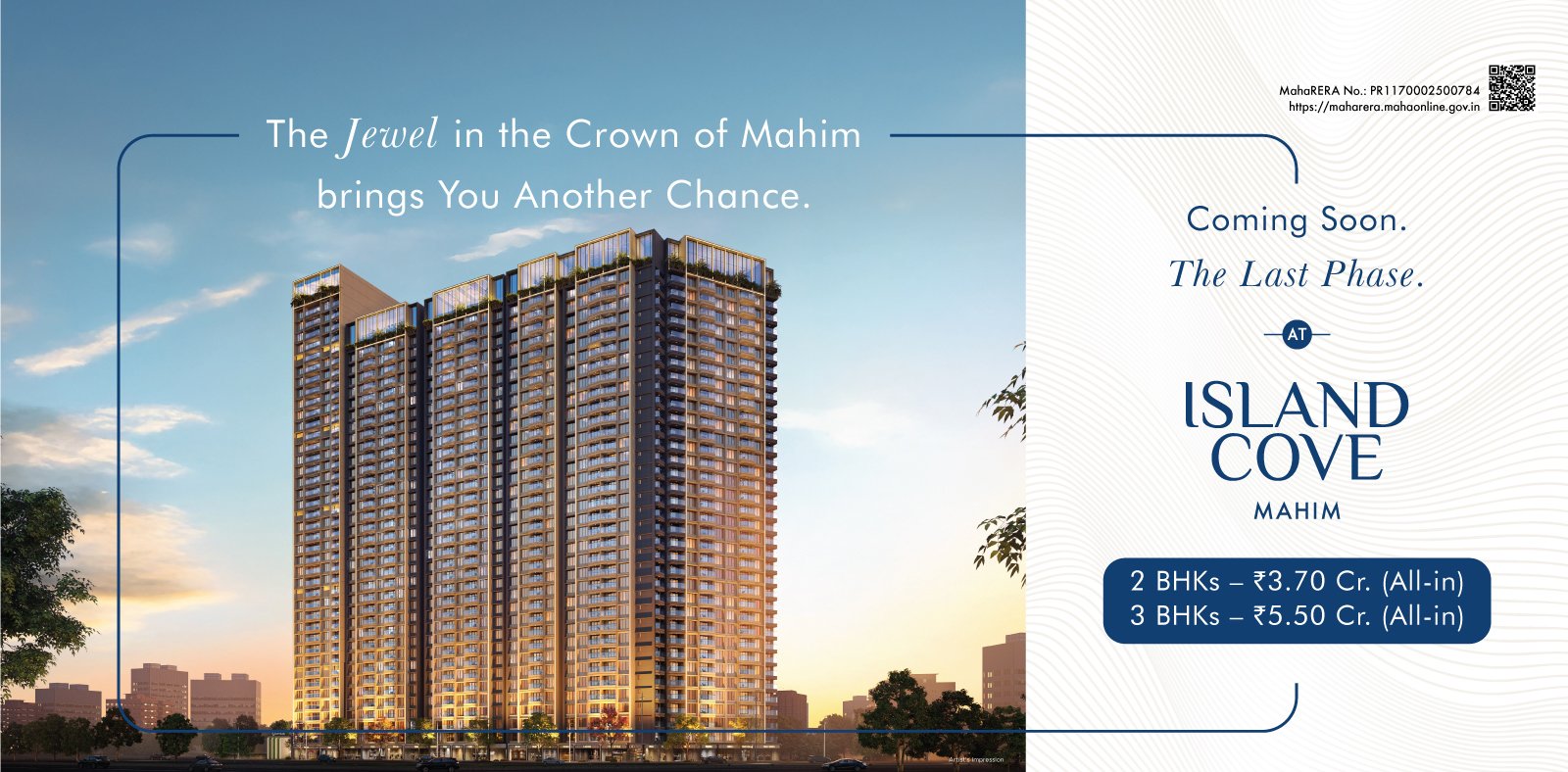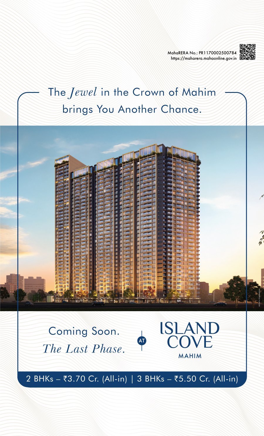 Welcome to Mahim. The doorway to the city of dreams, adorned with a timeless historical charm. Here, the bustle of the city greets you, and aspirations find their avenues. In the midst of it all, lies a sanctuary in the form of Island Cove Mahim, where everything you desire is within reach. Where your mornings begin with unobstructed views that stretch far beyond the city limits, with luxury apartments in Mahim that overlook the blue sea. Where every detail reflects a commitment to your comfort, with 2 and 3 BHK flats in Mahim’s first-ever gated community. Where memories can be made, shared and cherished. Where you can experience Mahim like never before.